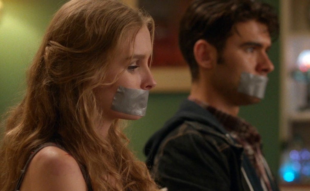While hiding in a closet, Ashley notices that the figure hunting them is wearing one of Luke’s masks. It turns out the invader is Garrett, and the two had staged this home invasion as a way for Luke to impress Ashley by “saving” her, after finding inspiration in an article that links fear to arousal: